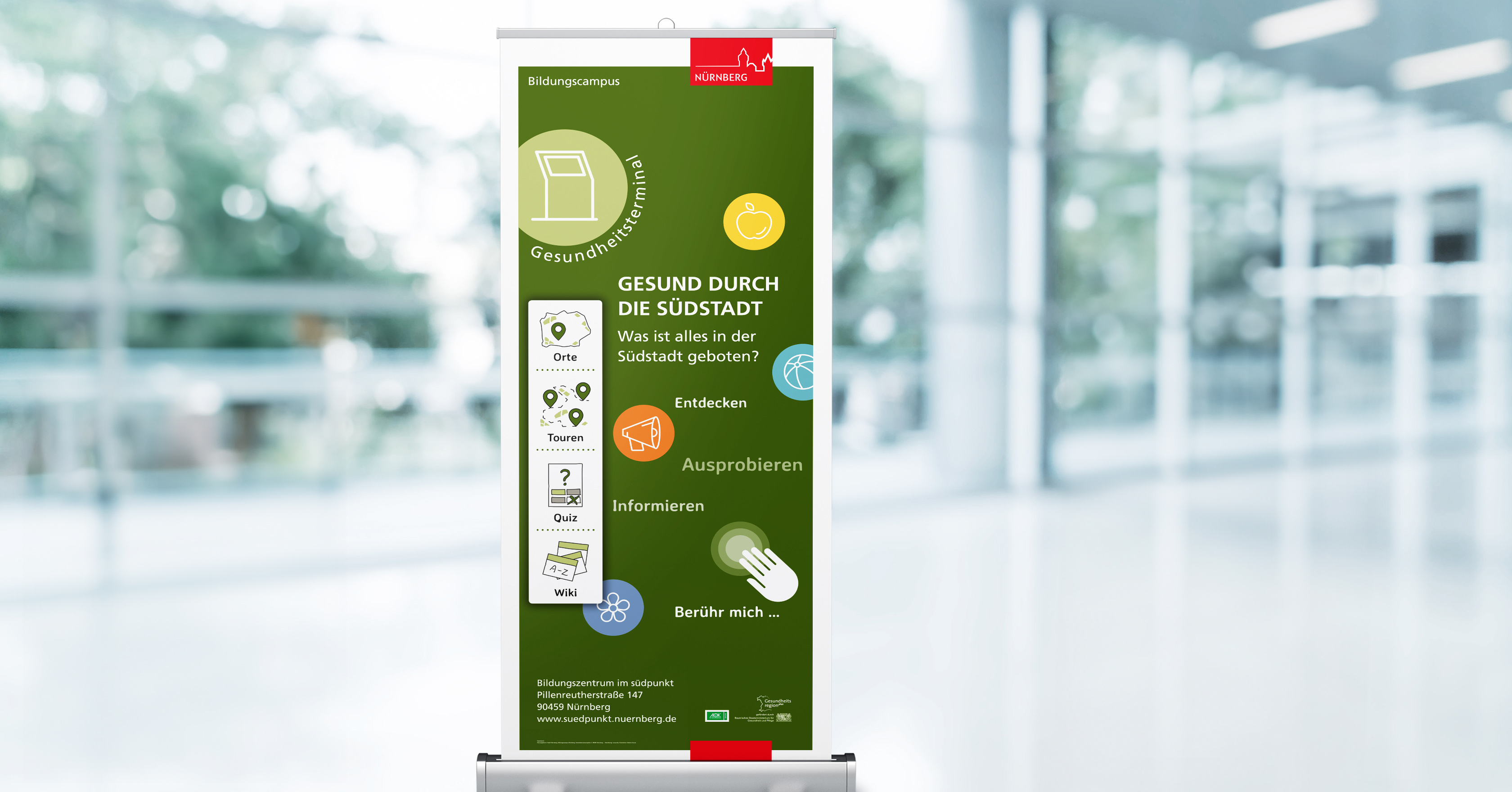 Außerdem: Um im Haus und darüber hinaus auf das Angebot aufmerksam zu machen, wurden Rollups, Faltblätter und Werbeartikel entwickelt und produziert.