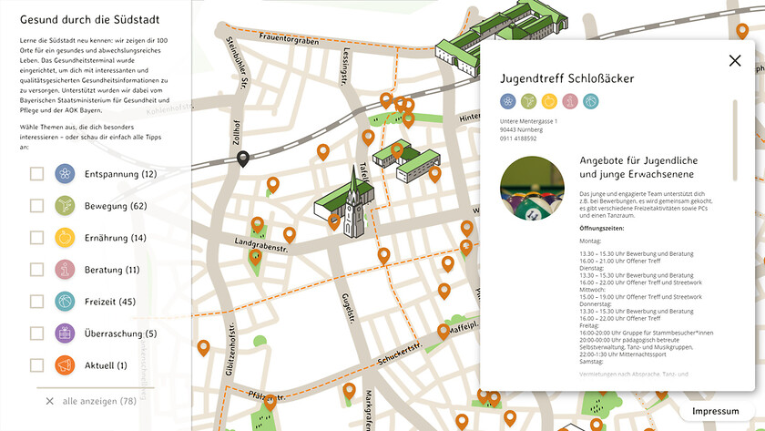 Ein interaktiver Stadtplan in handgezeichneter Optik weist den Weg zu gesunden Angeboten in Nürnbergs Südstadt