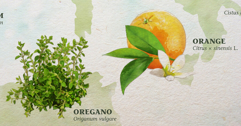 Wandbild und Infografik: klassische Illustrationen der Rohstoffpflanzen des Naturprodukte-Herstellers und ihre Herkunftsgebiete