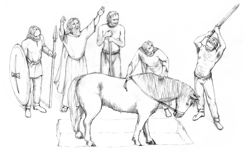 Dazu wurden von mir vier Situationen illustriert: die Tötungsszene, das tote Pferd, der Fundort am Hügelgrab und der archäologische Knochenfund.