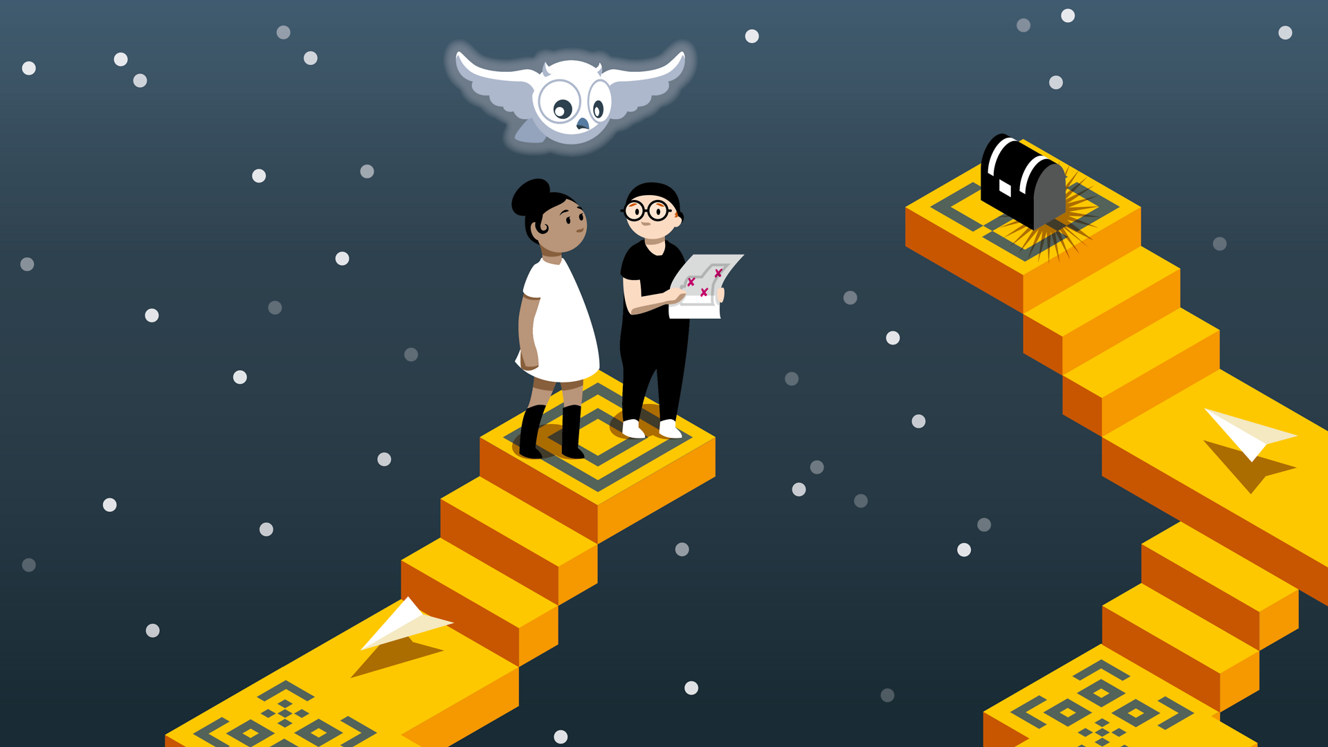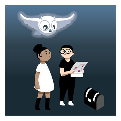 Begleitet werden Sophie und Jonathan von einer Stimme, die viel über die Bibel weiß und Tipps gibt – und hier die Gestalt eines freundlichen, eulenähnlichen Wesens erhalten hat, das auch bildlich Licht ins Dunkel bringt.
