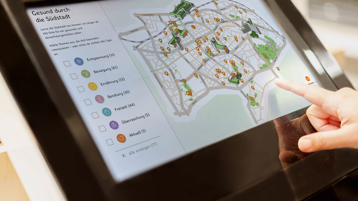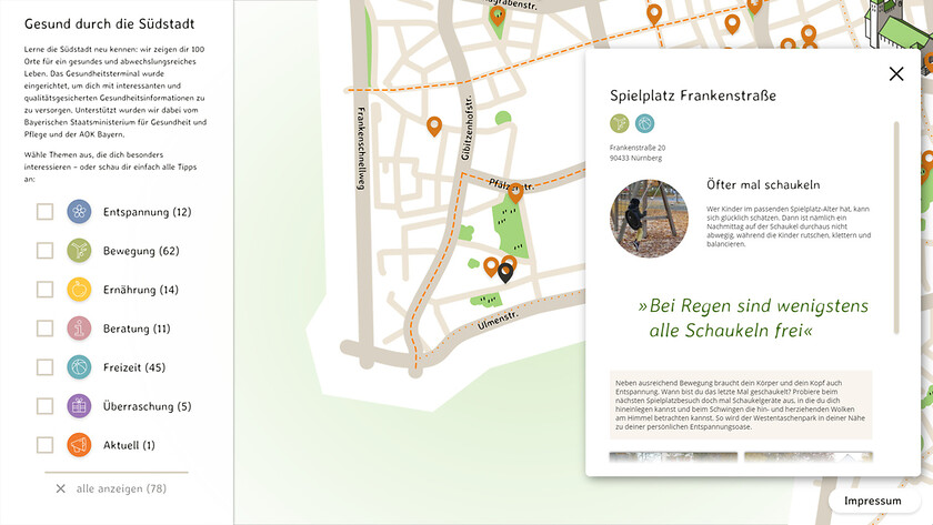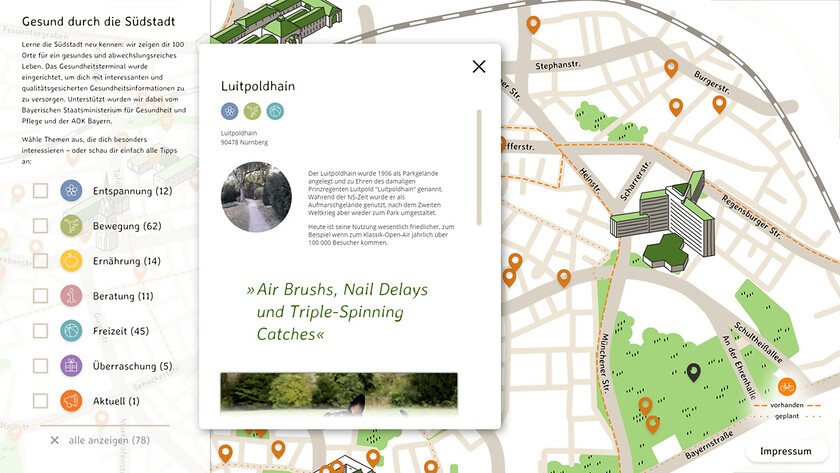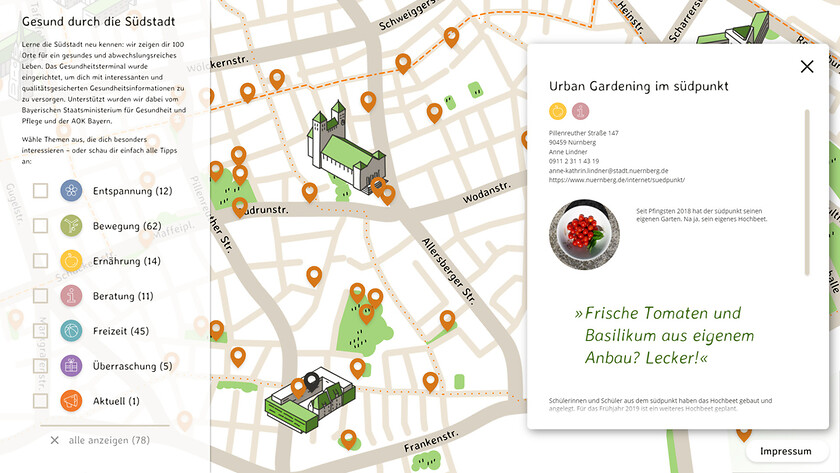 Ein interaktiver Stadtplan in handgezeichneter Optik weist den Weg zu gesunden Angeboten in Nürnbergs Südstadt