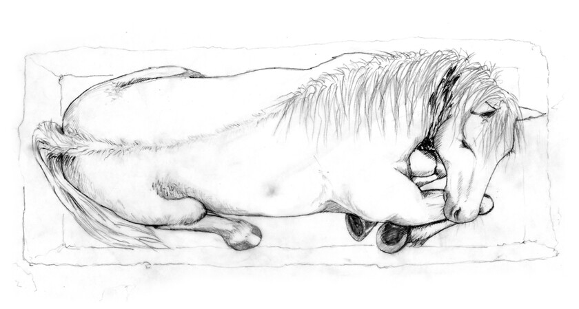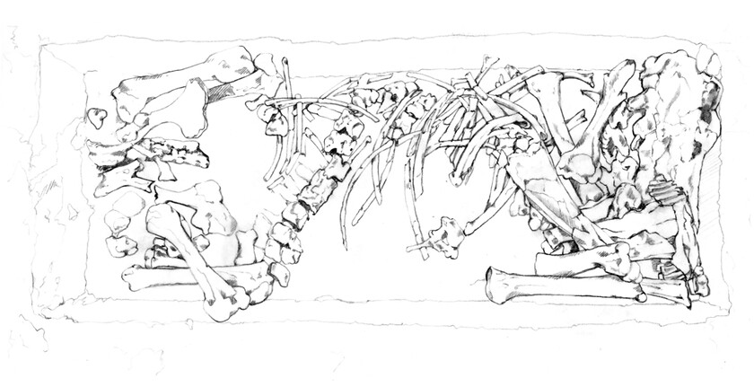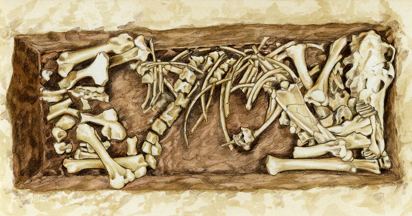 Dazu wurden von mir vier Situationen illustriert: die Tötungsszene, das tote Pferd, der Fundort am Hügelgrab und der archäologische Knochenfund.